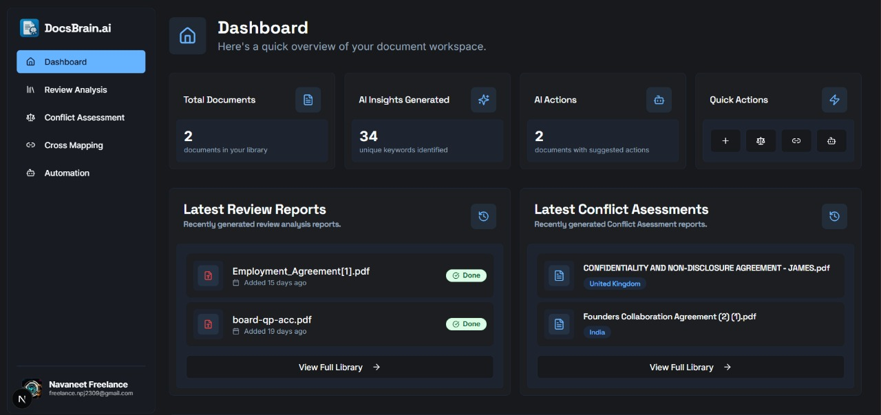 - Conflict Assessment analysis: Automatically find conflicts, and contridictions, structured into Overview, Risk Score, Clause-wise, and automated actions.